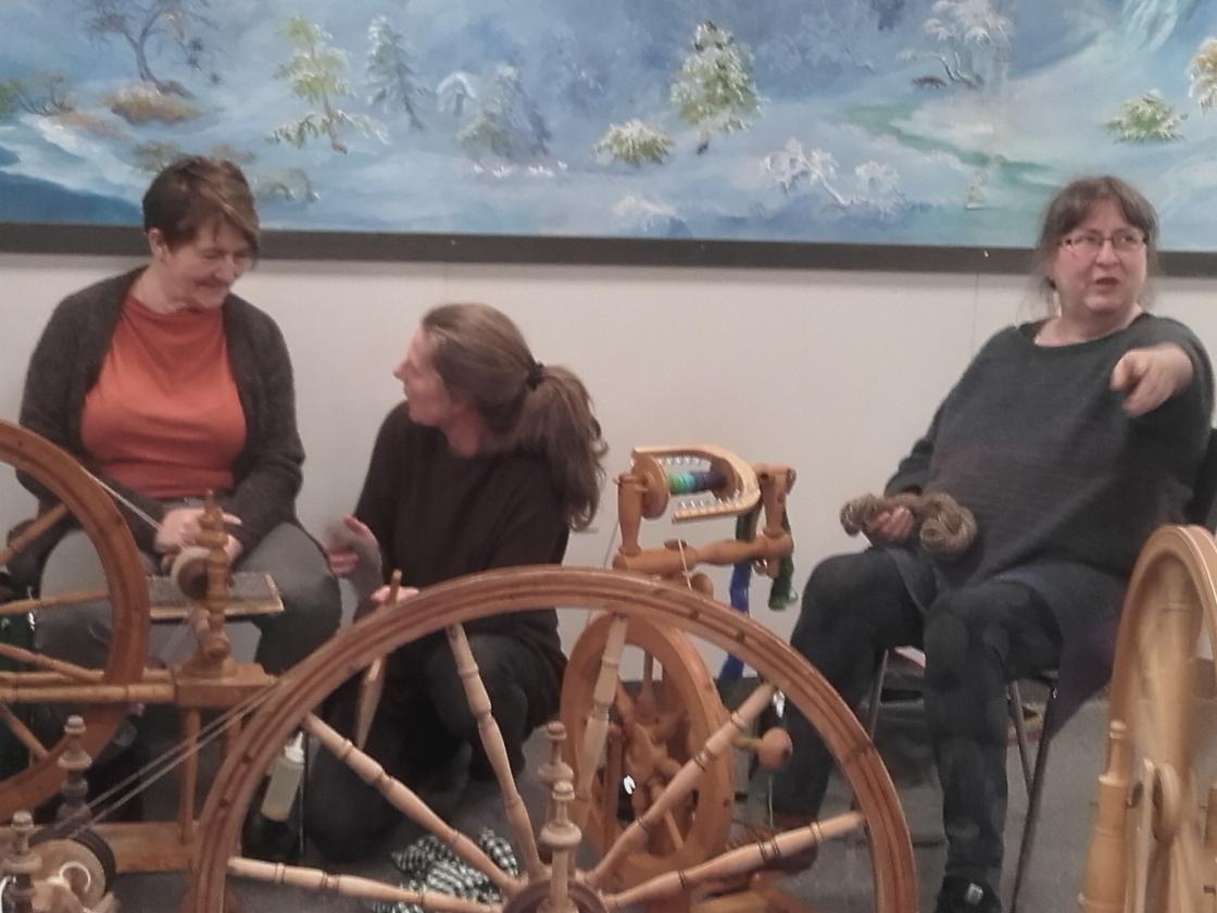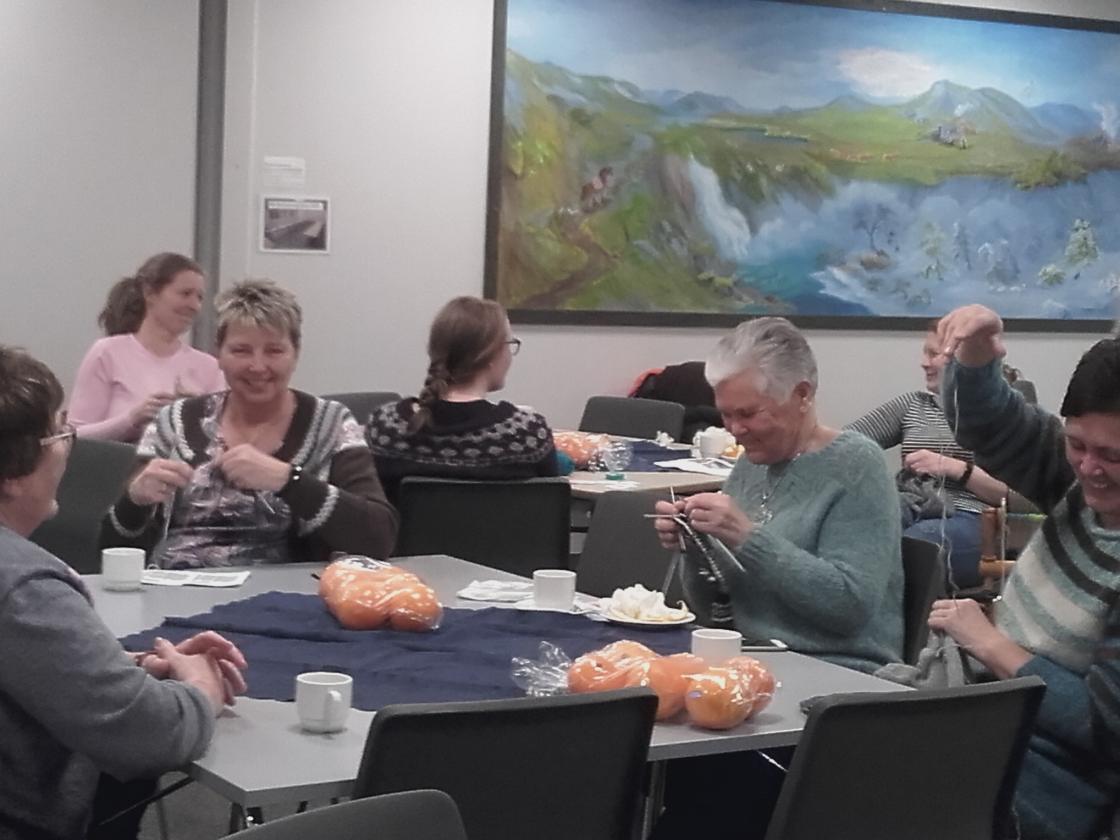 Praten gjekk livleg rundt borda mens strikkepinnar og rokkar durte i vei. Det vart nokre kjekke timar med kaffi,te og vafler og jamvel eit lite lotteri med fine gevinstar.