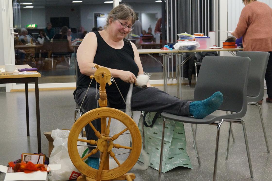 Ja, så har vi nok ein gang hatt ein kjekk og lærerik strikkekafe i Grendahuset. Mange møtte opp, og at de unge er flinke til å komme, syntes vi er kjempekjekt! Sigfrid Olsen kom for å demonstrere Tuppeware. De fleste hadde noe de ville kjøpe. Vi fikk og gaver av Sigfrid til utlodningen vår og ein flott kasse med frukt og snop fikk vi av Joker ved Eivind Tokheim. Alltid kjekt med litt utlodning. Takk til de flinke "spinnedamene" med rokkene sine som møter opp hver gang. Sjølvsagt hadde vi kaffe og vafler til salgs denne gang også. Praten gikk livlig rundt bordene.