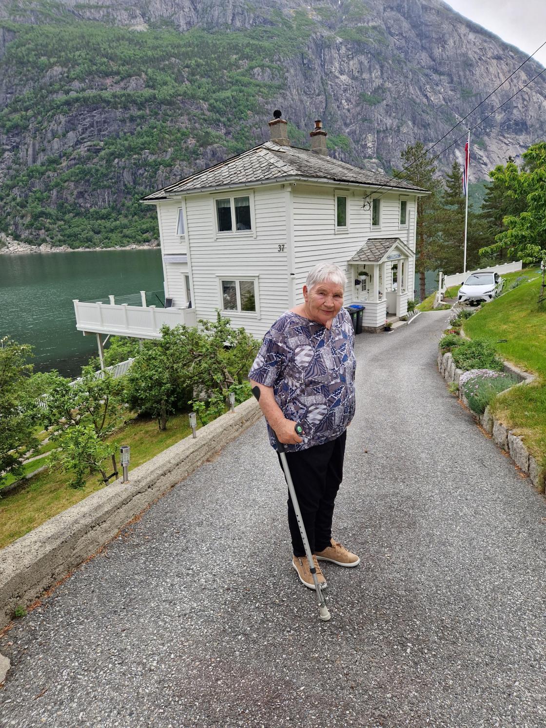 Margot og nevøen, som no har huset der Margot vaks opp. Kjekt for Margot og besøka plassen. Bilde tatt av Gunvor S.