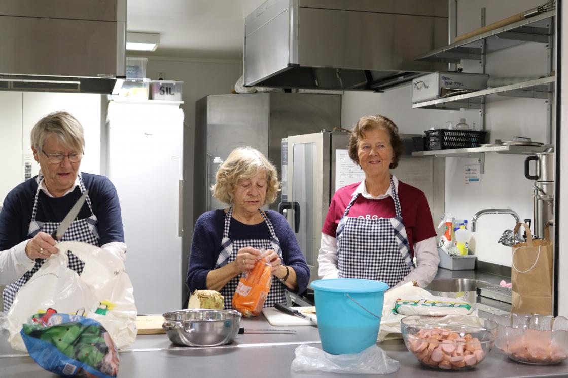Elevane var skikkelig ivrige med skrelling og oppskjæring av poteter, gulrøtter, purreløk, selleri og pølser. Bygggryn og røykekjøtt blei og brukt i suppa.Etter at suppa var kommet på kok, var dei ute for å finne høstpynt til bordene.