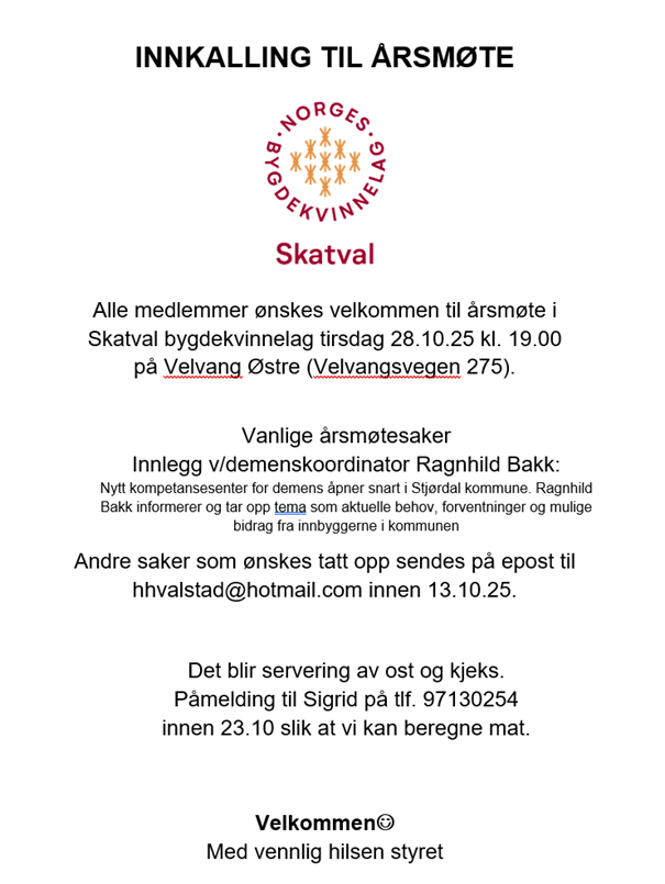Alle medlemmer ønskes velkommen til årsmøte i Skatval bygdekvinnelag tirsdag 28.10.25 kl. 19.00