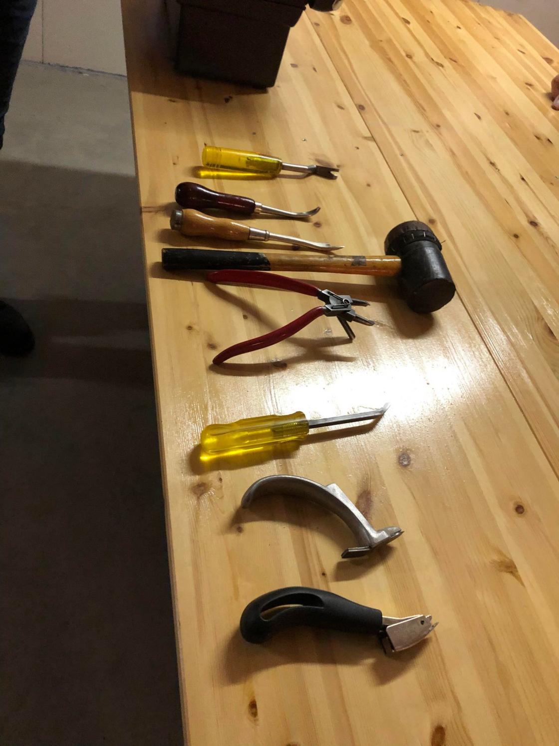 Tang, kniv, stiftmaskin/krampepistol, saks, hammer, nål og tråd og symaskin. Instruktøren vår, Trond Thomsen, har hatt med en del utstyr, stoffer og forbruksartikler som kursdeltagerne fikk låne eller kjøpe av ham.