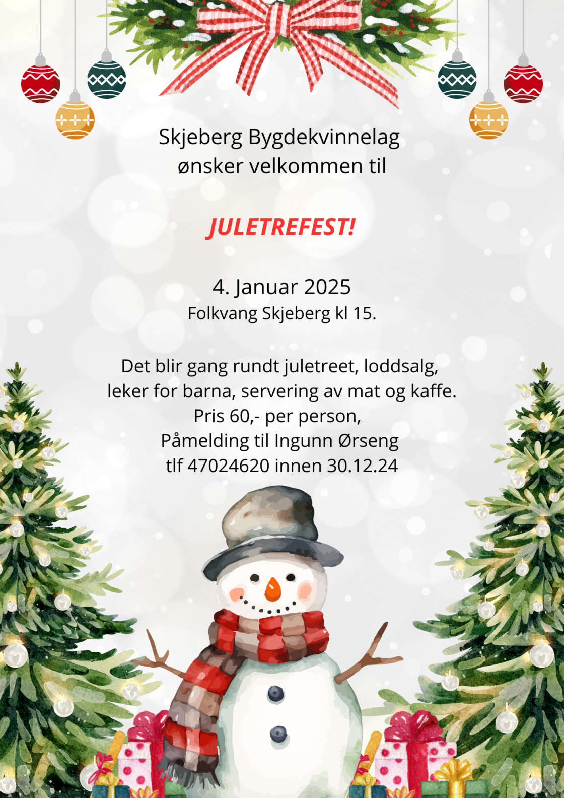 Forside Om oss Vevstua Juletrefest Jan 04 Sat Skjeberg Bygdekvinnelag Juletrefest! Folkvang Skjeberg lør 04.01.2025 15:00 Ingunn Ørseng, tlf 47024620 Del på:
