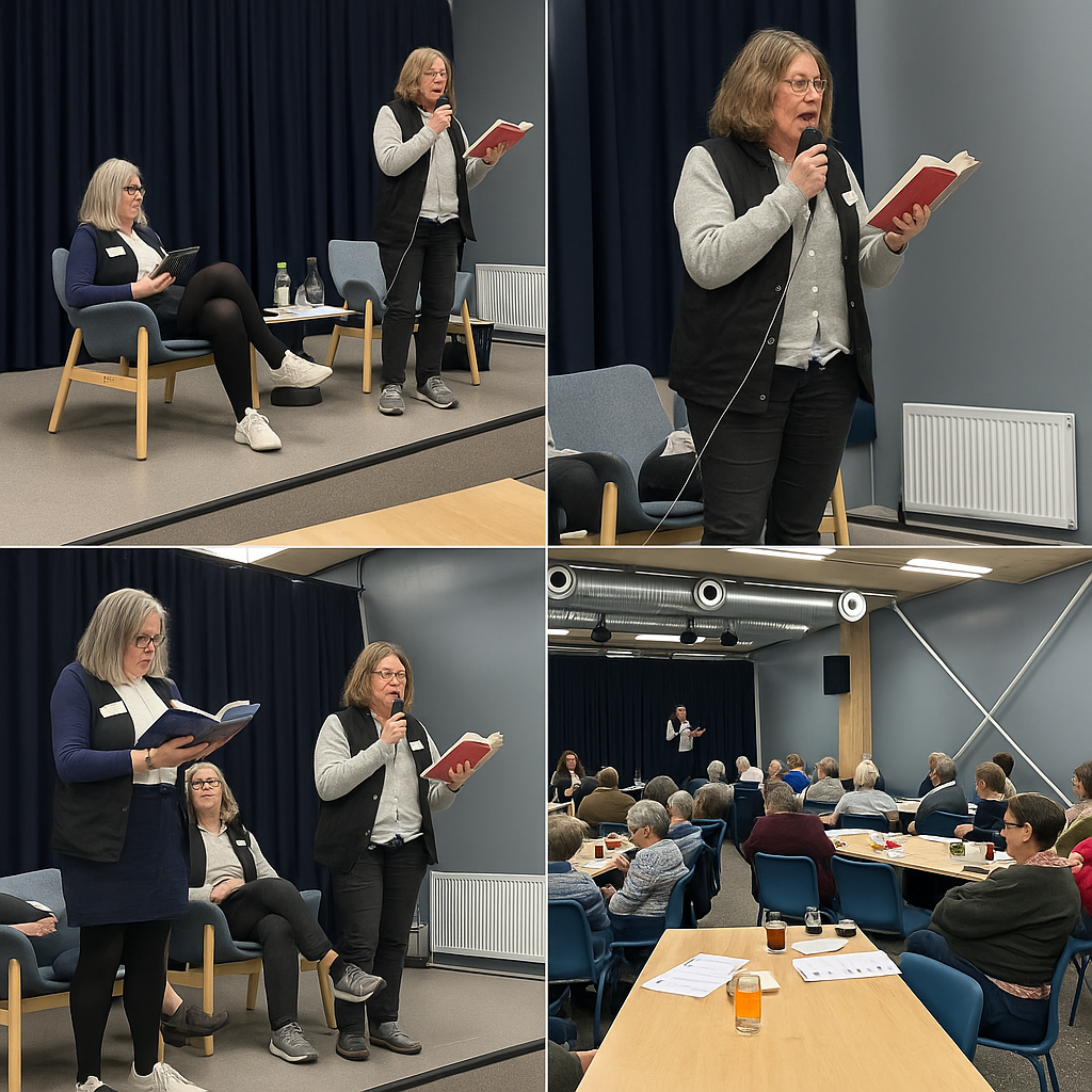 Vi fikk først en omvisning i alle etasjene av biblioteket, hvor vi fikk utførlig forklaring på både de kunstverk og arkitektmessige innredningene. Det var lærerikt og interessant, damene som viste oss rundt hadde god kunnskap og man kunne se at de la sin sjel i jobben sin. Etter det ble det servert rundstykker, og bakverk & kaffe mens vi fikk høre om 20 nyutgivelser på bokfronten i 2025. Alt i alt ga kvelden mersmak til flere besøk til Sarpsborg Bibliotek!