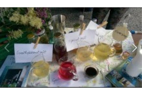 Grete Slang delte ut smaksprøver på egenprodusert saft av Geitrams, Svarthyllblomst, Mjødurt og Bjørkeblad,