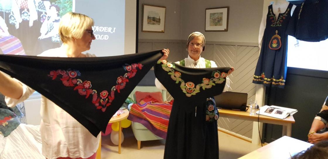 Vi inviterte til møte om Bunadene i Østfold i går. De 35 stk som kom fikk høre en kunnskapsrik og engasjert foredragsholdere i Gro Staal Martinsen og Ellen Kvamsdal fra Østfold Husflidslag. Vi fikk høre om norsk Bunads historie og om opphavet til forskjellige bunadene vi har her i Østfold.