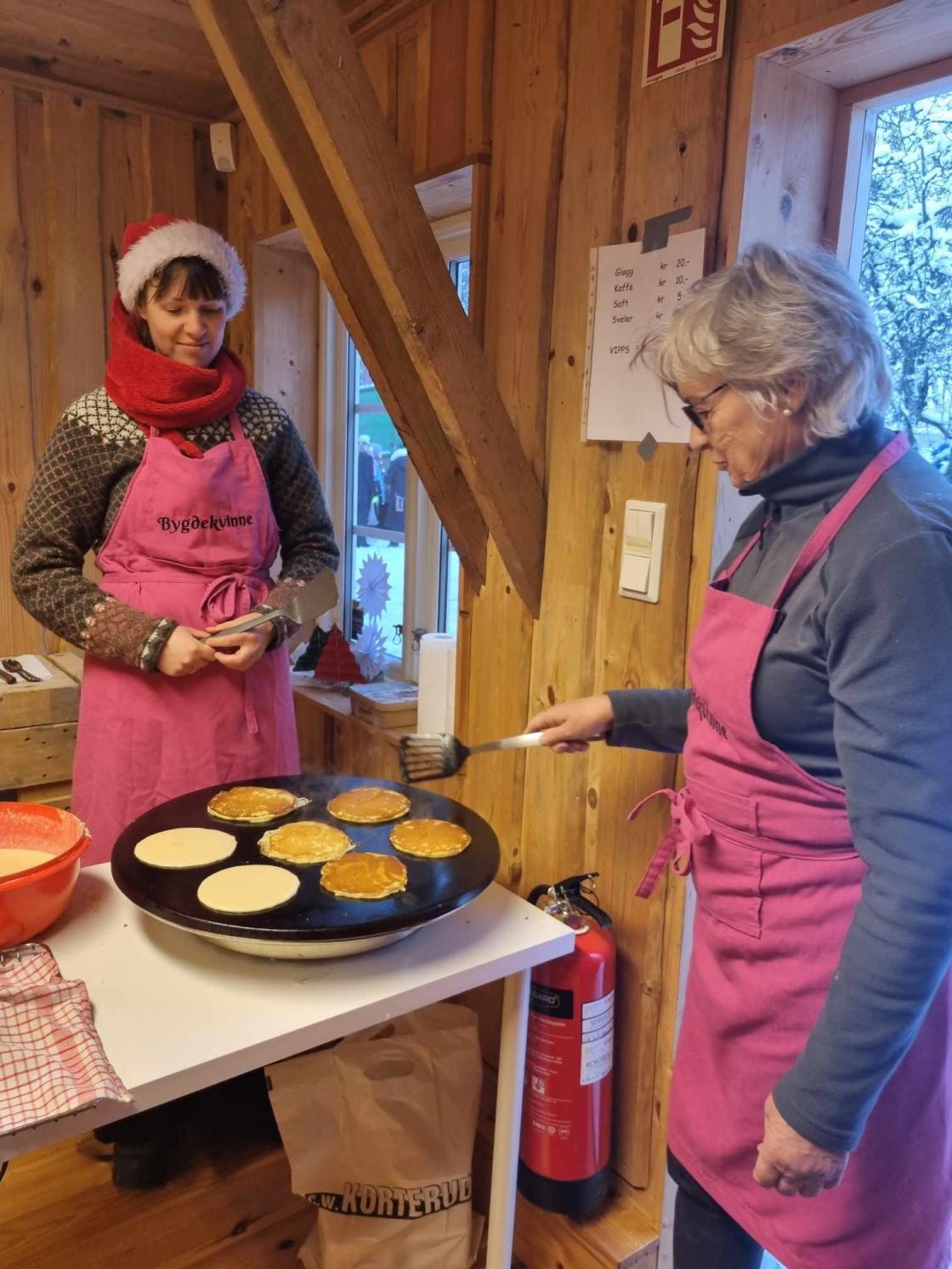 I samarbeid med andre lag og foreninger, ble det arrangert Julegård på Vollene. Vi i bygdekvinnelaget stekte og solgte sveler. Inne i hovedhuset sto vi og lagde og solgte flatbrød.