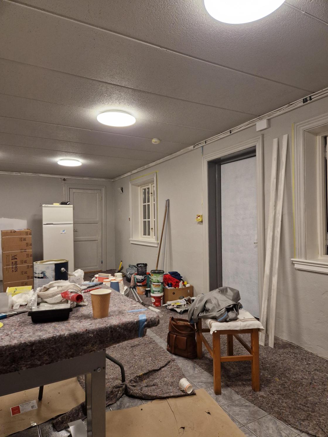 Vi er 17 personer som hittil har bidratt med ca. 200 timer totalt på oppgradering av bryggerhuskjelleren på Stokke bygdetun. Vi har ryddet, kastet, vasket, pusset og malt tak, vegger, dører og vinduer i en og samme gråtone.