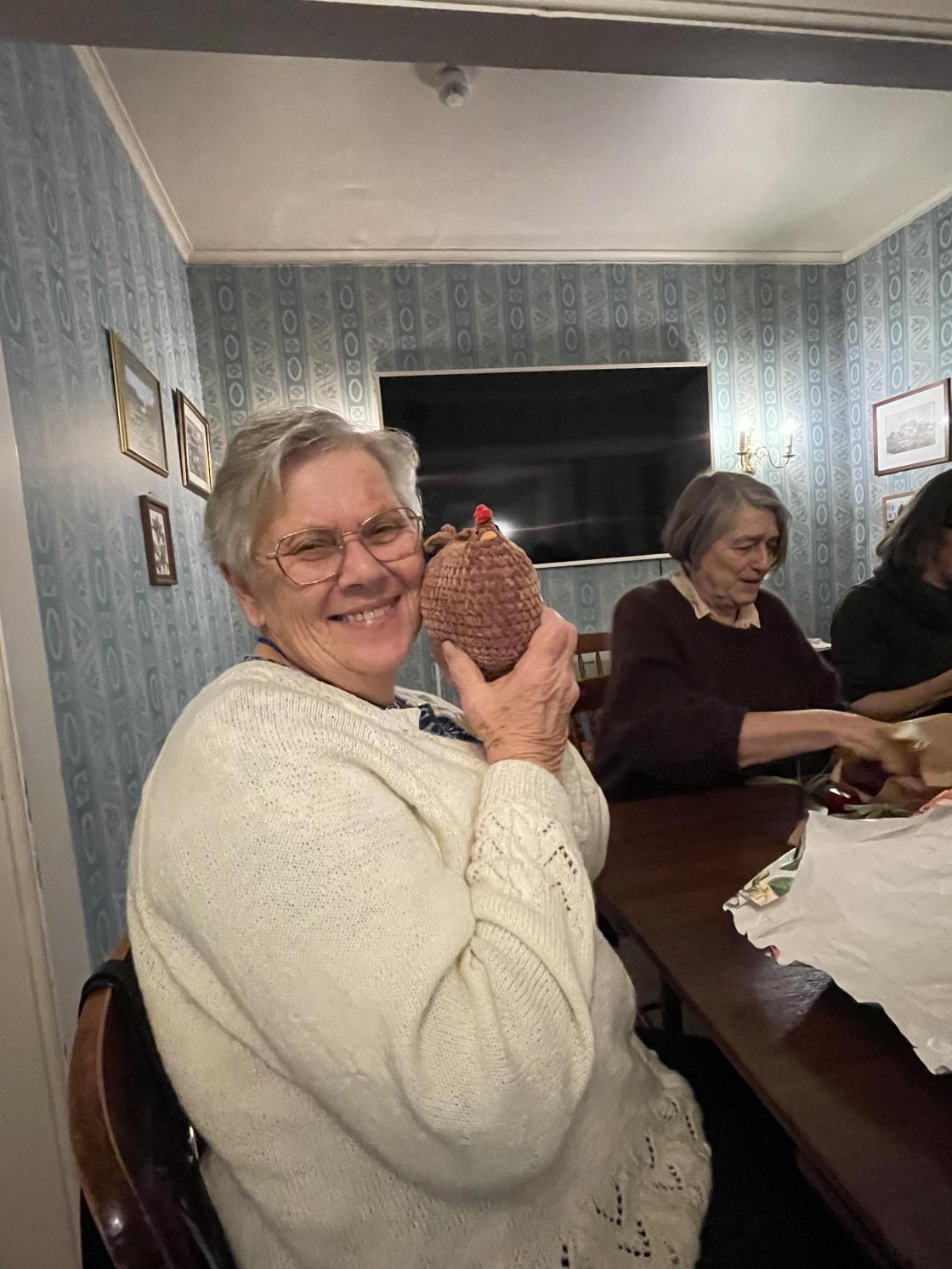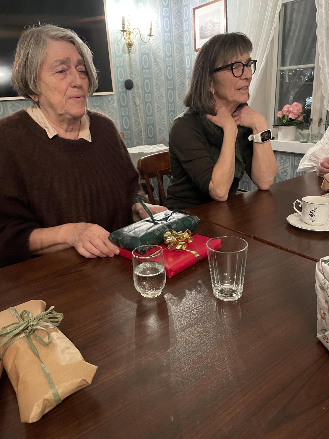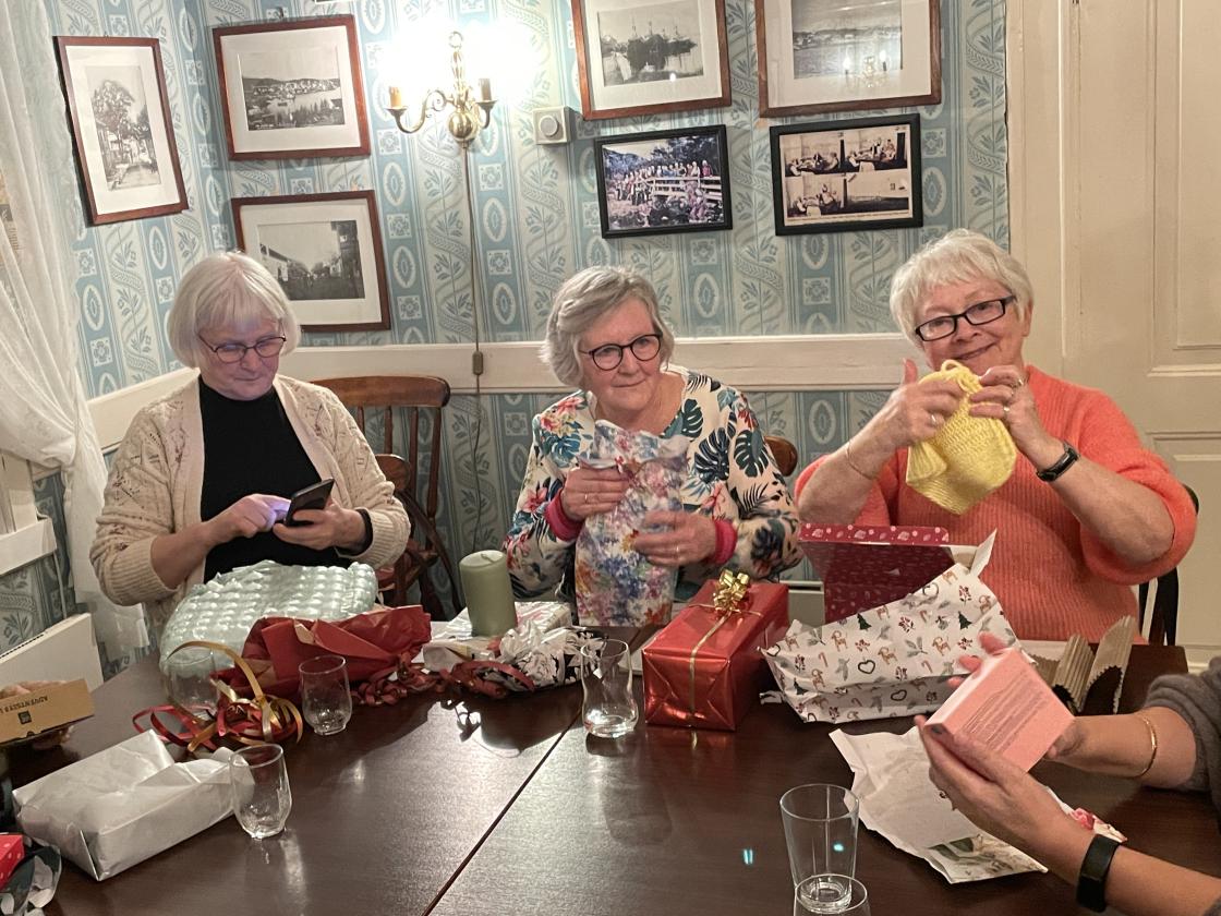 Vi koste oss lenge med all den gode maten, og et hyggelig bordsete. Etter hvert måtte heklebrikkene vike for pakker og terninger. Det blir alltid masse leven og dårlige vitser. Noe vinner mye, noen vinner lite, men vi er like blid.