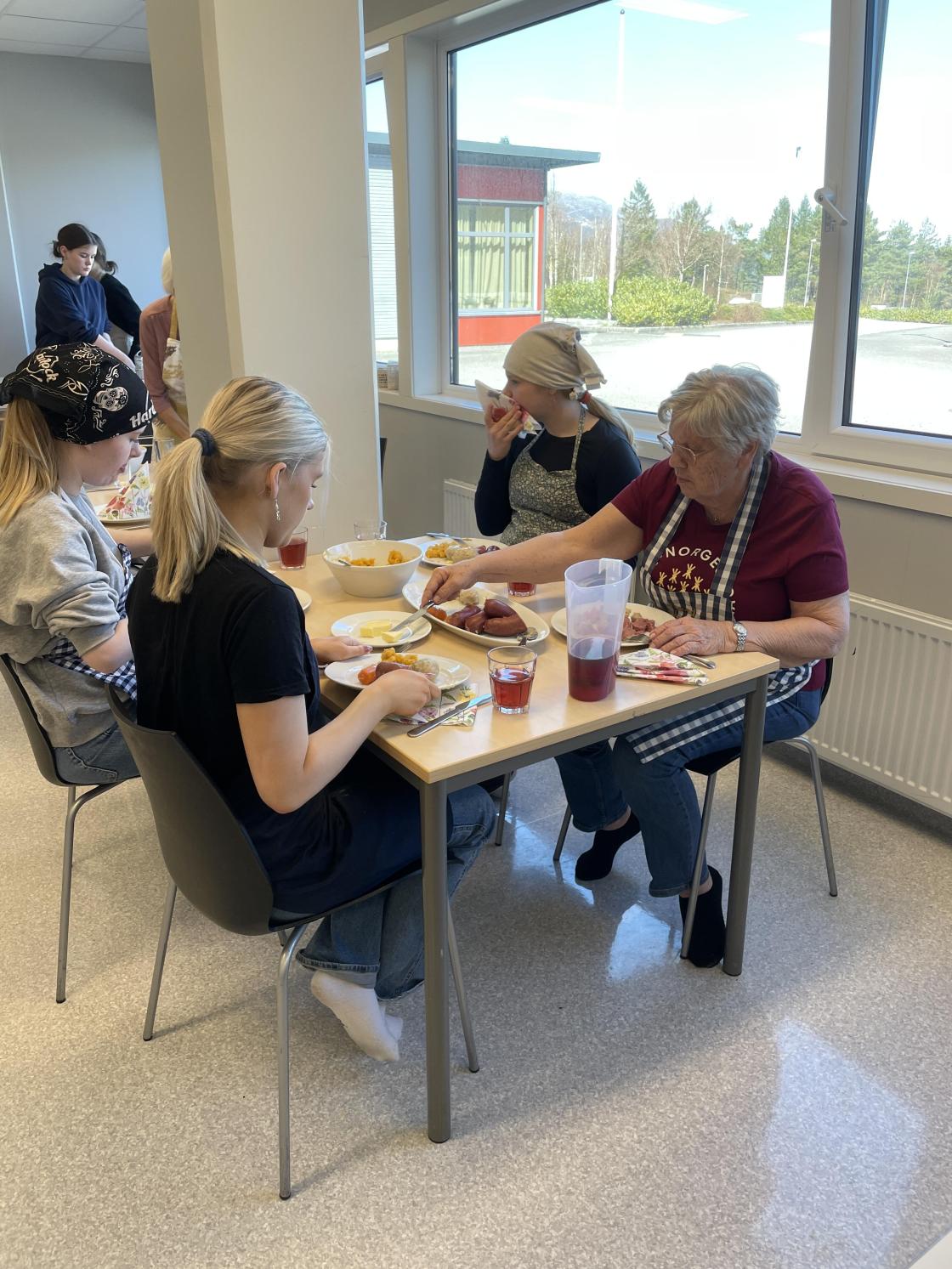 Bygdekvinnelaget handlet inn det som trengtes for å få til en enkel komlemiddag. Med to timer til rådighet er det ikke mulig å koke kjøtt og starte med å skrelle poteter. Derfor ble det Stangeland mølle sitt komlemel og grove pølser fra Lundal i Åkra. Vi laget også kålrabistappe med søtpotet, og vi hadde kokte gulrøtter ved siden av. Bordene ble fint dekket, og vi hadde et trivelig måltid i lag. Det som ble igjen fikk de med seg hjem til foreldrene. Som alltid; flinke og arbeidsomme elever, og hjelpsomme Bygdekvinner.