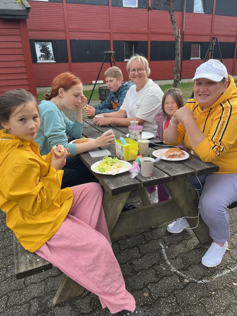 Det var Internasjonal Kulturklubb som arrangerte et sosialt samkome for beboerne på Heiane Mottak. Røde Kors og Bygdekvinnelaget var med og hjalp til. 50 store og små var påmeldt. Veronica fra IKK arrangerte leiker, Elisabeth fra Røde Kors var grillmester. Berit, Mariann og Rigmor fra Bygdekvinnelaget delte ut mat, og alt ble spist opp. Sigrid fra IKK delte ut drikke, og hadde den store oversikten. Både barn og voksne hadde en hyggelig dag. Sommerferien er lang for de som bor på mottak, da det ikke er så mye som foregår da.