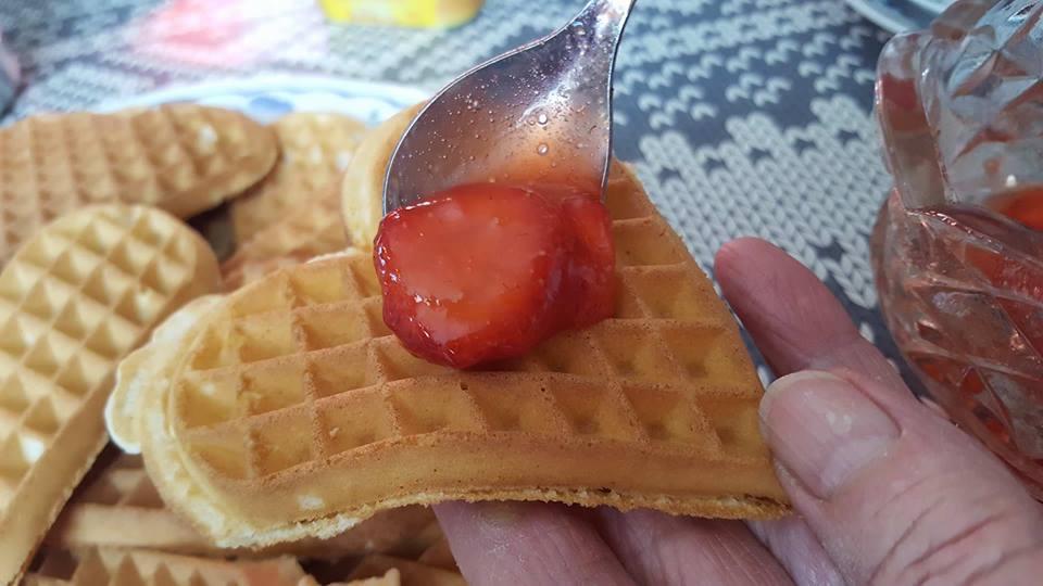 Kaffe med vafler og hjemmelaget jordbær, og fruktbrød var også veldig godt!