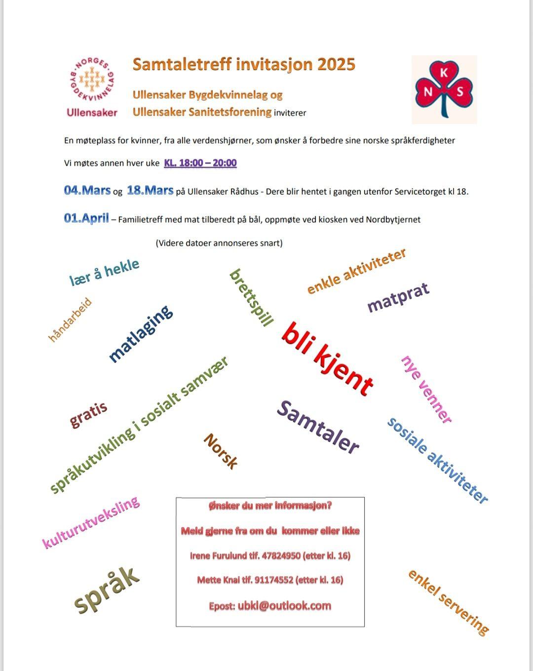 Ullensaker Bygdekvinnelag og Ullensaker Sanitetsforening, i samarbeid med NAV Ullensaker arrangerer samtaletreff for kvinner fra hele verden som ønsker å forbedre sine grunnleggende ferdigheter i norsk språk. Gjennom sosiale aktiviteter og kulturutveksling blir dette en møteplass for å gjøre enkle aktiviteter sammen, gjennom matlaging, brettspill mm. Det viktigste er å bli kjent med hverandre på tvers av landegrenser, og bygge sosiale nettverk.