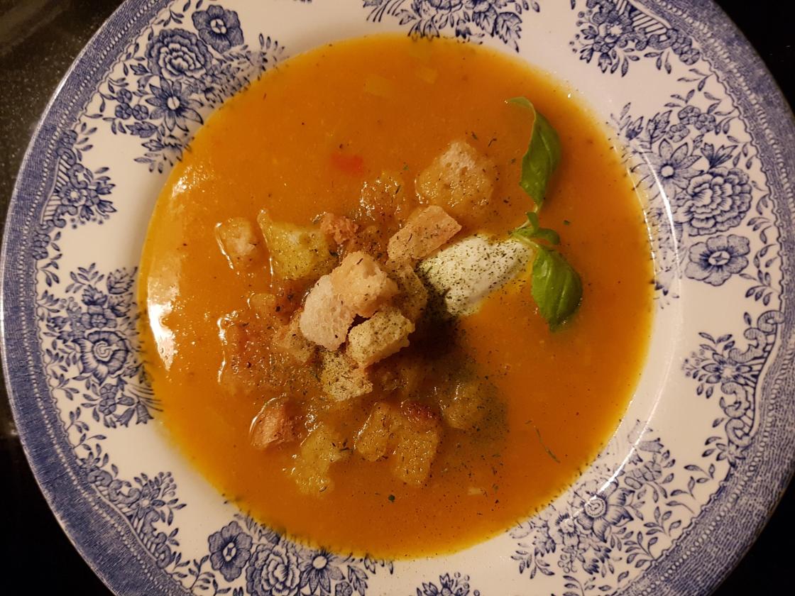 Servering, gulrotsuppe. Kringle og kaffe.