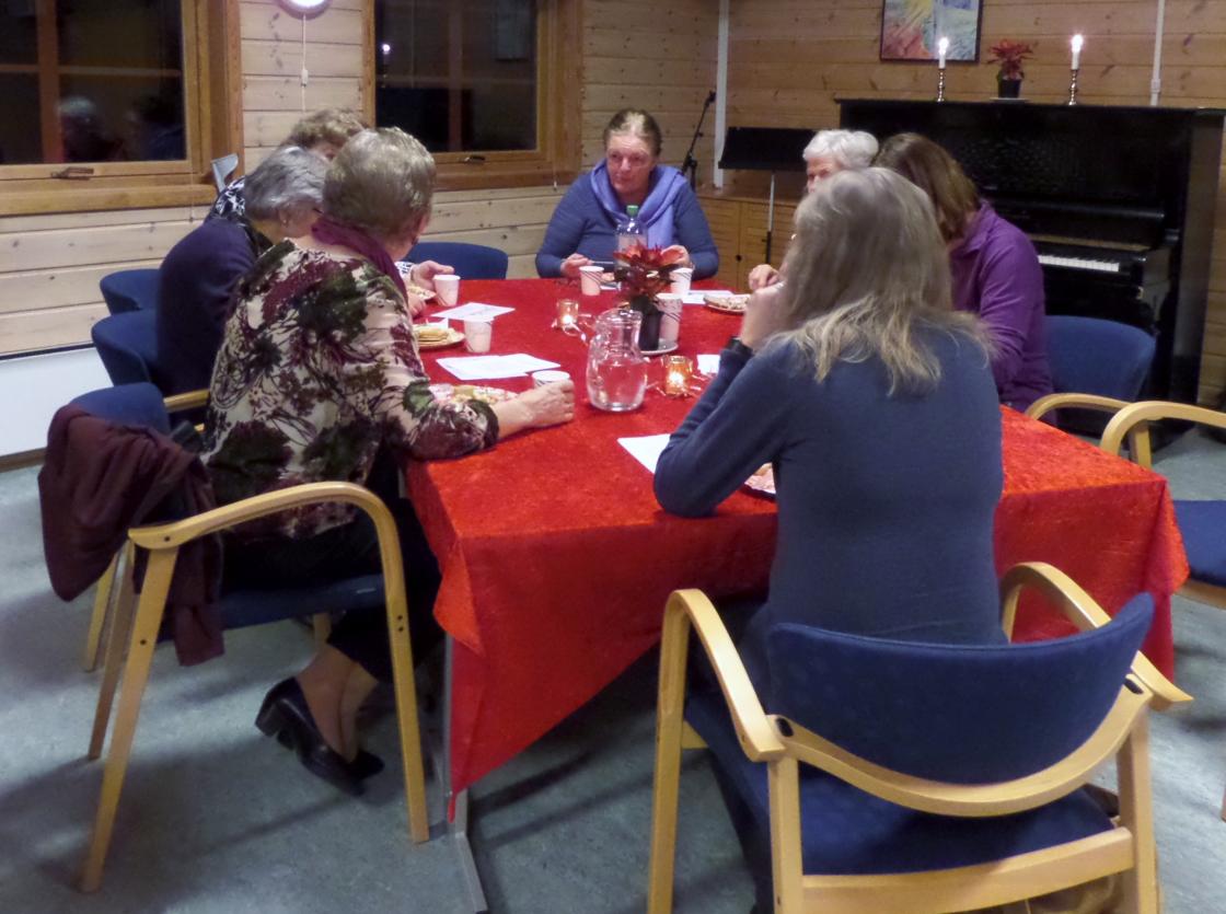 30 damer hadde møtt fram til denne hyggelige kvelden på Menighetsstua ved Furuset kirke. De ble ønsket velkommen med gløgg i julepyntet «stue».