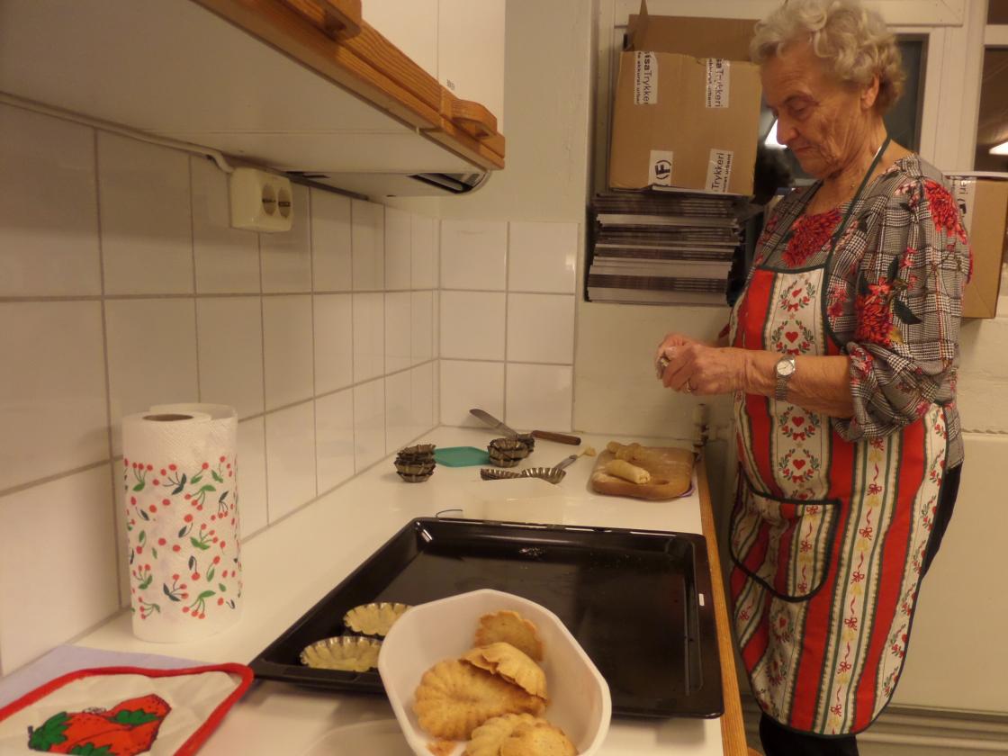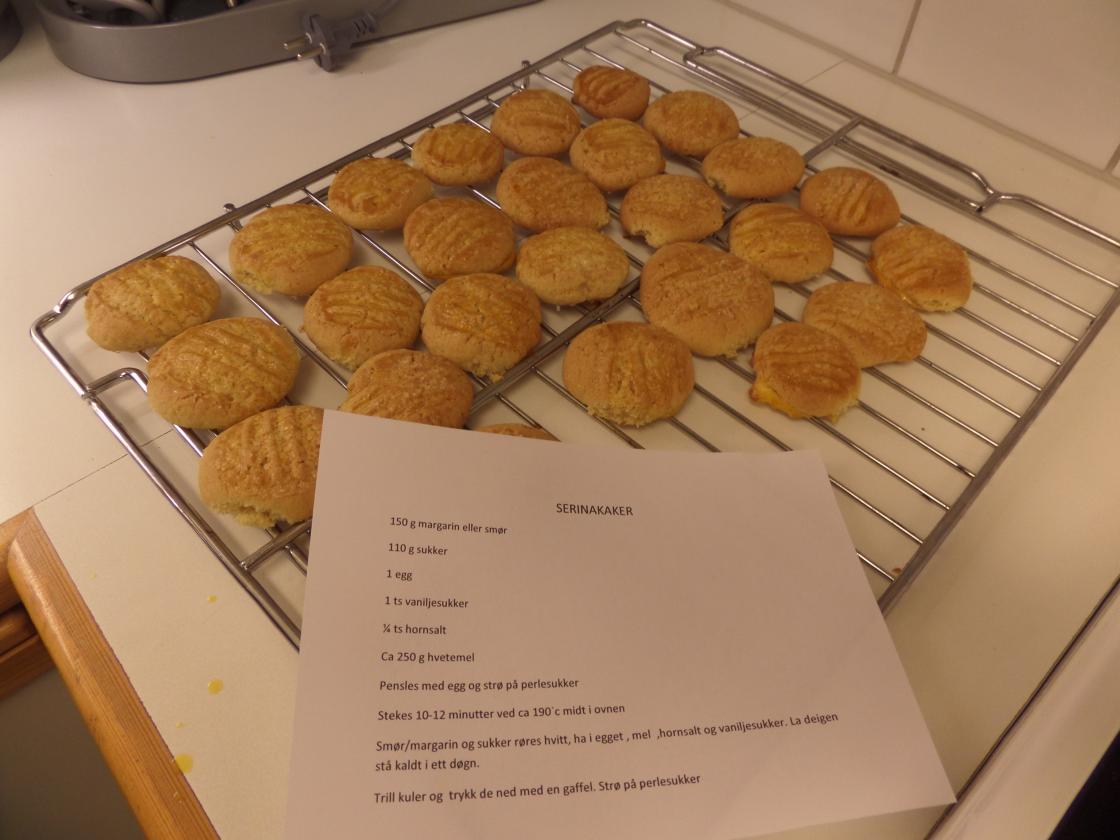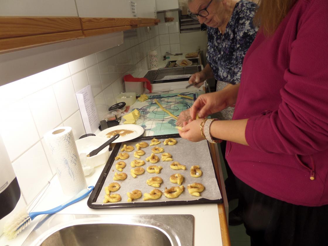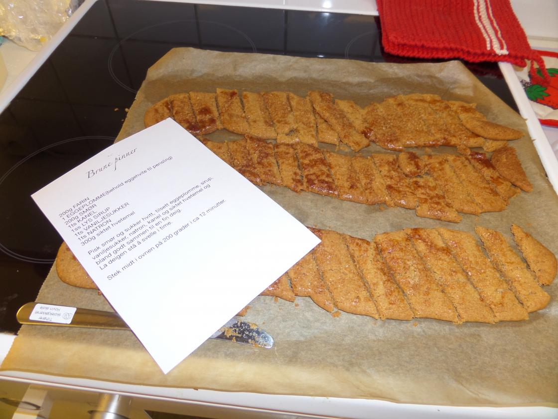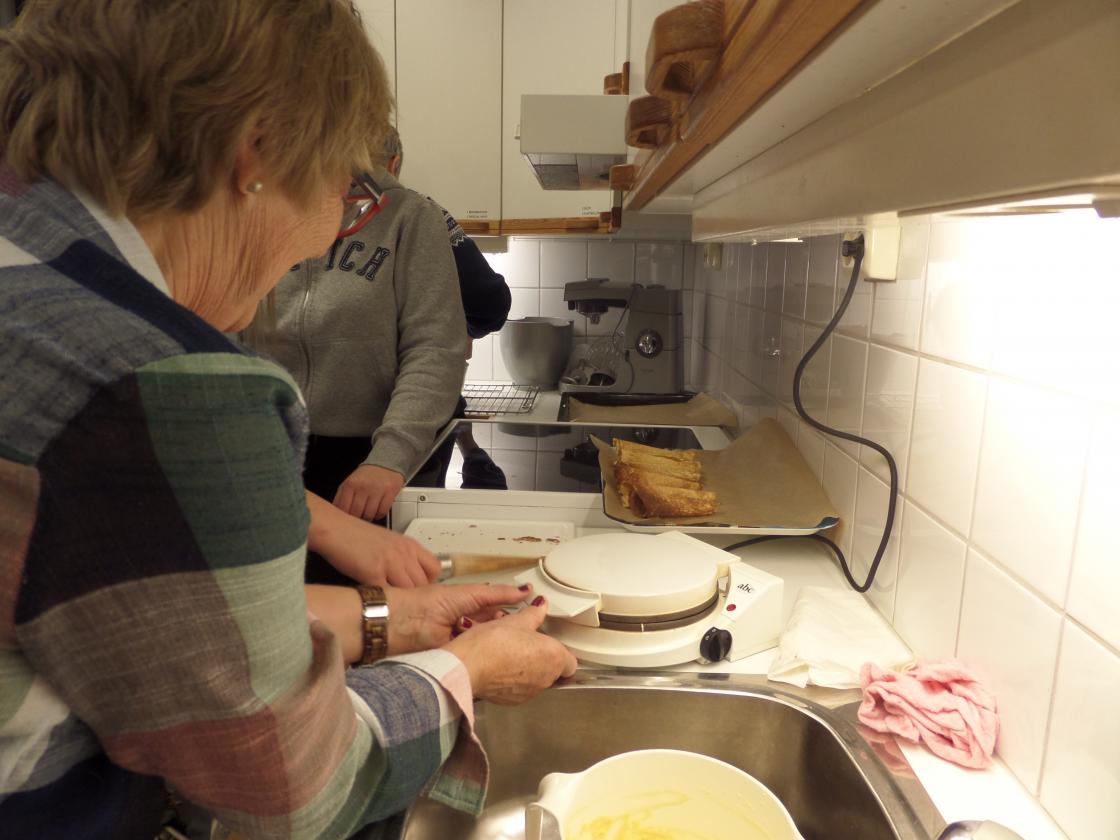 Oddveig stekte smultringer- i smult. Deigen var laget på forhånd. I den var det mye godt, blant annet egg, seterrømme, konjakk og meierismør. Inger sto for berlinerkranser, Kirsten bakte sandkaker. Formene hun brukte var 100 år, tror jeg hun sa. Lisbeth stekte krumkaker. Helene stekte både serinakaker og havreflarn. Hanne stekte brune pinner, populære kaker.