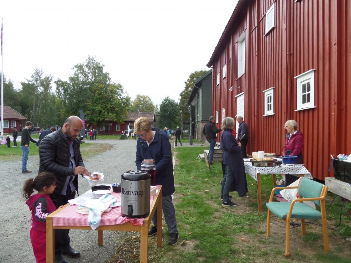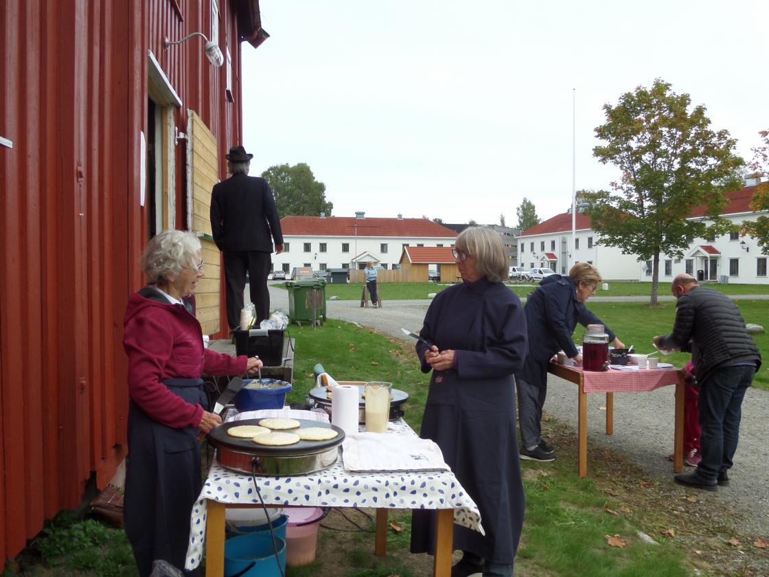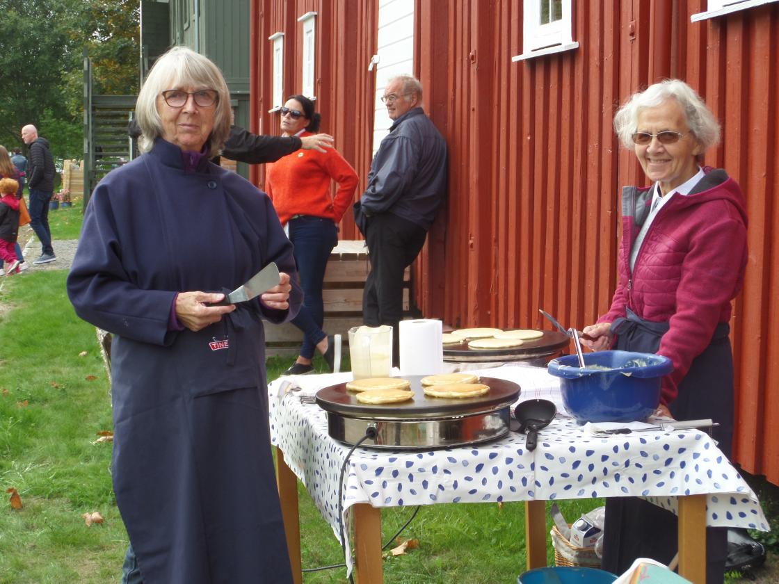 Ullensaker Bygdekvinnelag deltar på Barnas dag på Ullensaker Museum søndag 16. september 2018. Det blir solgt sveler, saft og kaffe. Sigrun og Anne Lise sørger for nystekte sveler.