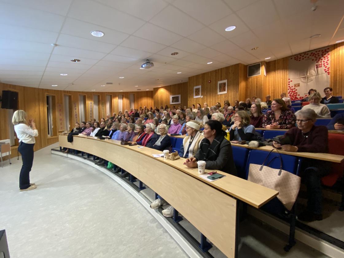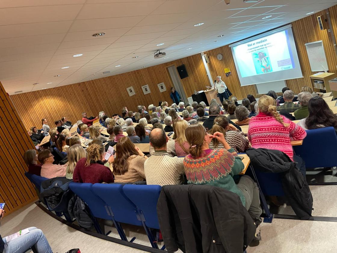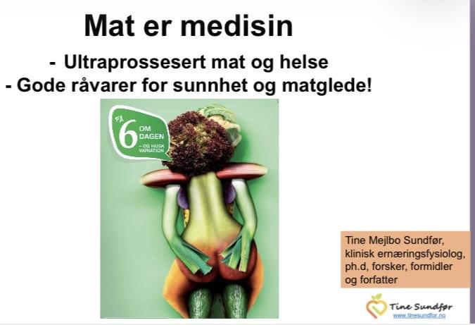 Med klinisk ernæringsfysiolog Tine Mejlbo Sundfør ved mikrofonen med tema ultraprossesert mat og helse, måtte dette bli bra, for maken til engasjerende og inspirerende formidling! Som en tilhører uttrykte etterpå: Hun kan virkelig det hun snakker om og svarer på spørsmål på en folkelig og forståelig måte.