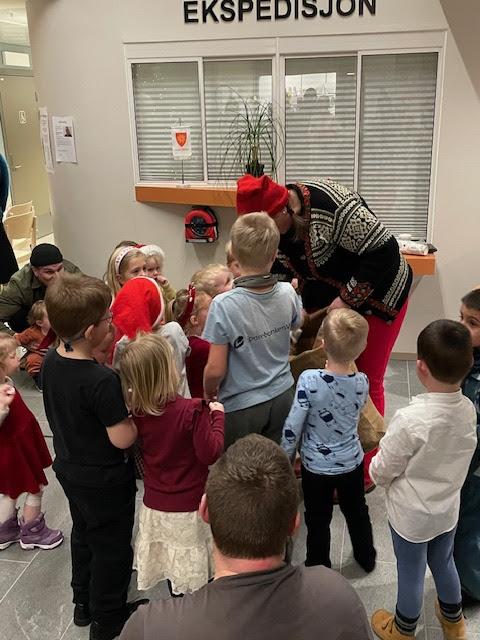 Det var ei lita songstund, før det vart høgtlesing av ei jolaforteljing av Alf Prøysen. dei aller minste vart invitert til å samlast framfor Åsa(Gunnarsdottir), slik at dei skulle høyra ekstra godt. Borna følgde engasjert med og synest historia var spennande.
