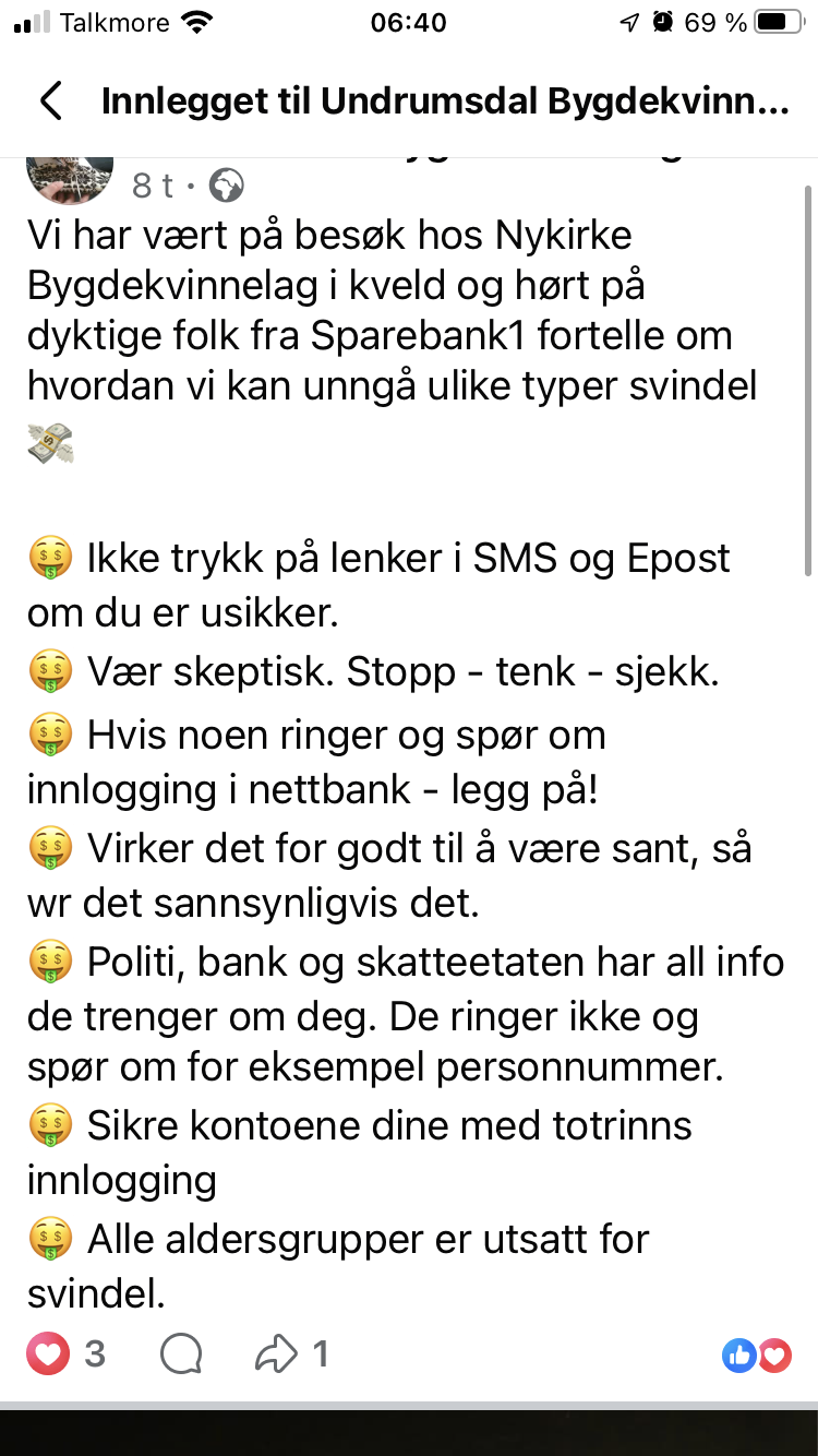 Flere av våre medlemmer besøkte i går Nykirke bygdekvinnelag med tema “Hvordan oppdage og unngå IT svindel”.
