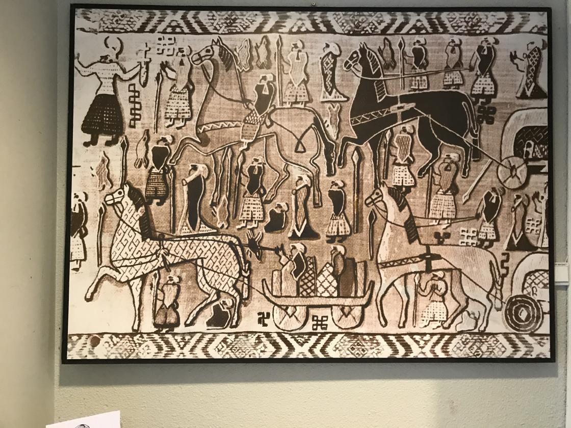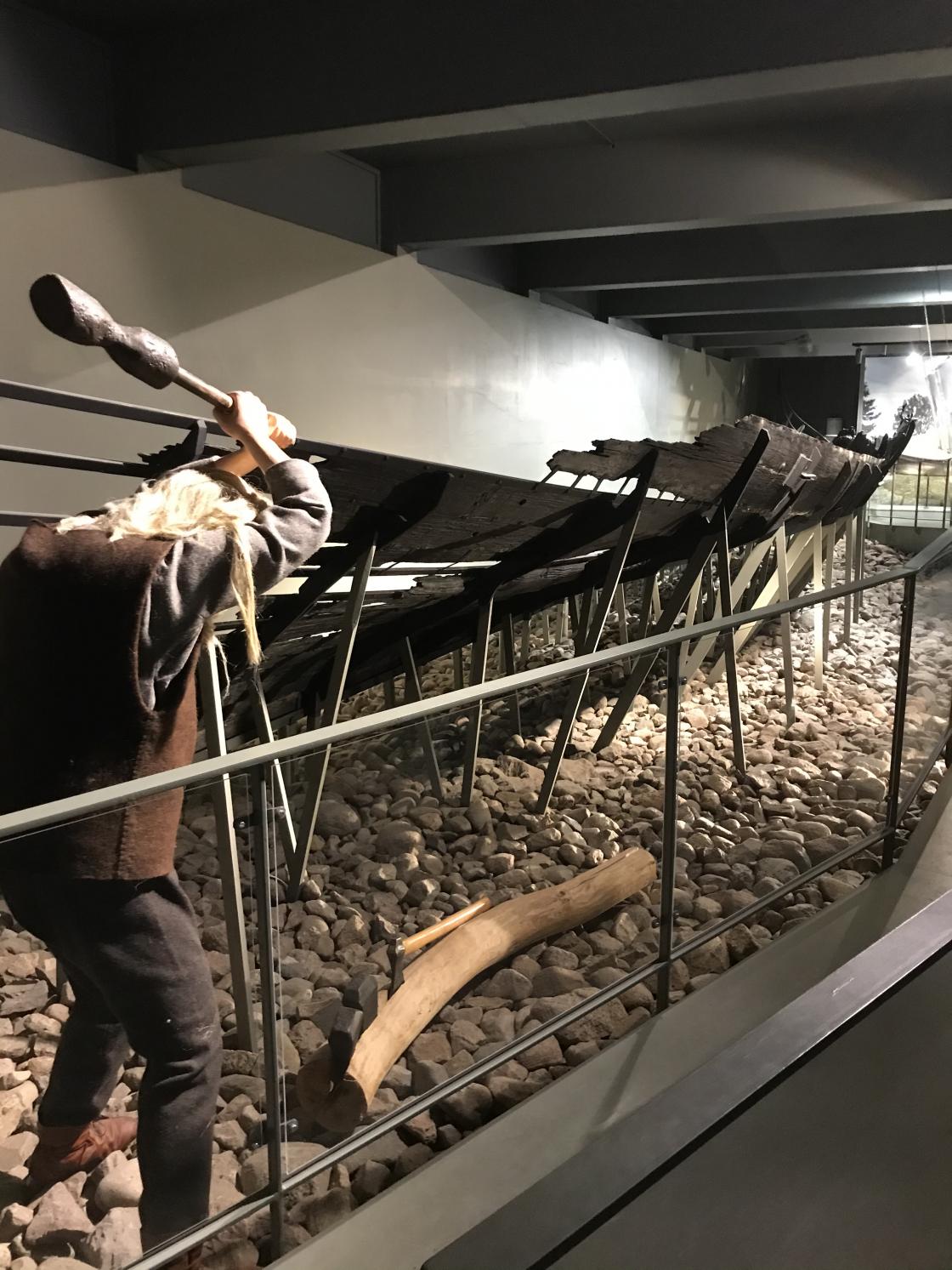 Dette var en givende formiddag i et ufyselig regnvær. Men været var ute. Inne på museet var det lunt og deilig. Vårt første oppdagelse var et tydelig bilde av Osebergskipet fra utgravingen. Det var tydelig og fint. Et skip som tydet på rikdom. De to kvinnene var godt utrustet til sin videre seilas. Vi ble også vist et bilde av et vevd arbeid fra Osebergskipet med prosesjon, store hester, store verdier og symbol om soltilbedelse. Det var tydelig både menn og kvinner (bukser og skjørt). Dette er noe av vår første dokumenterte arv. Vi tittet på bilder fra Osebergskipet og så "vrak" av Klåstadskipet.