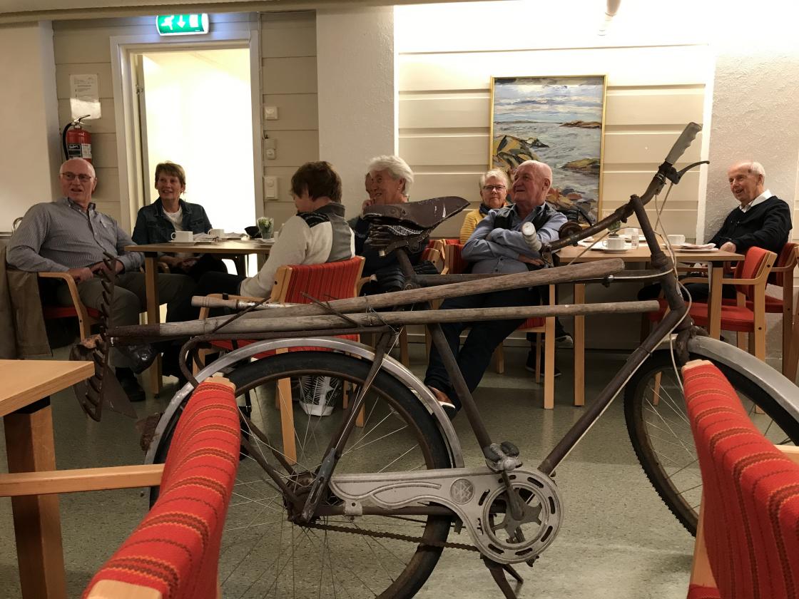 Leder Jorunn Kjærnes ønsket 19 stk velkommen og mer ble ikke sagt før "Veiviseren" kom trillende inn i lokalet med sin godt brukte sykkel og spade og hakke... Han hilste de gamle kjerringene og presenterte seg som Anton Slurebakken. Ble nok overrasket over forsamlingen som også besto av noen menn. Han fortalte mangt og meget om et slitsomt liv som veivokter. Mange stikkrenner og humper var ordnet i hans tid. Og brøytepinner - noe han fremdeles advarte oss om å ta i bruk på egne turer.... Flere av historiene om de "late" veiarbeiderne ble gjenfortalt - innpakket i egne fortellinger. Som at tresko var ubrukelig, da de kunne slå rot 😂. Han hadde forstått etter bare ei uke at spaden var sveiset fast av smedens læregutt. Det var mye klage på veien i Gregershølet og ellers. Lastebilen skranglet så gebisset ble lagt i hanskerommet -, men da ble vognkortet eti opp 🤣😲. Flere gode historier fulgte, men jeg oppfordrer heller til å møte opp når vedkommende skal være gjest.