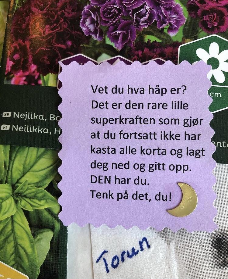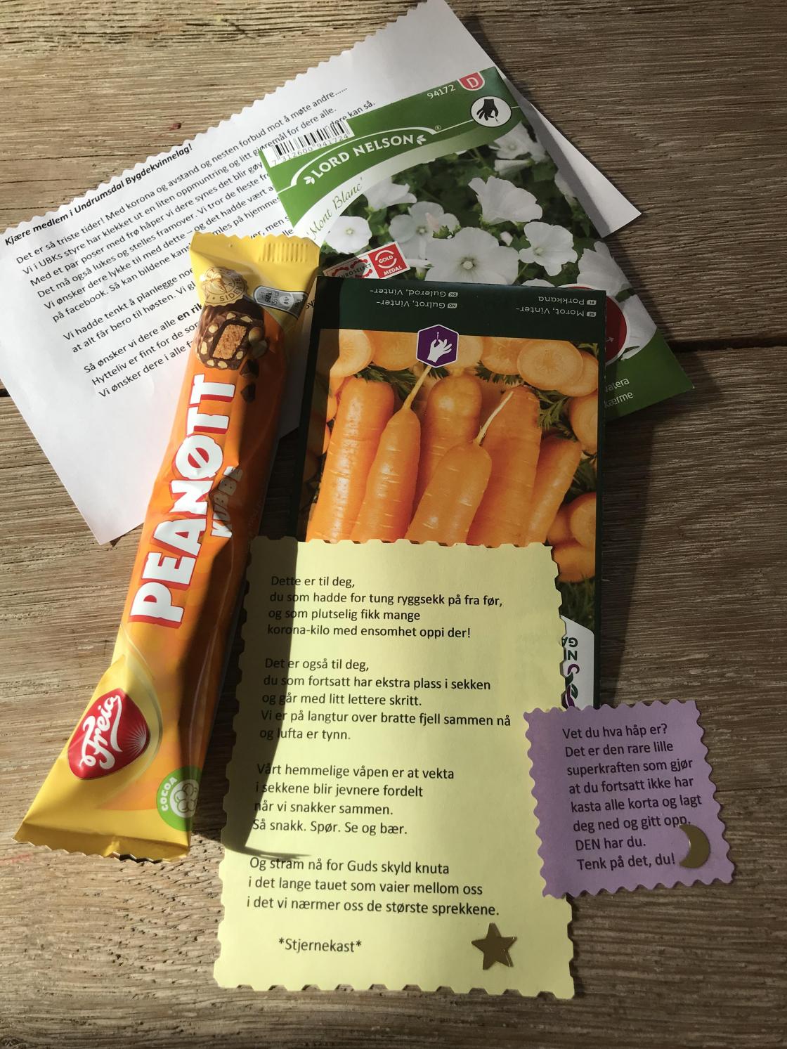 Så vi skrev et lite følgeskriv, lagde noen små ark med noen ord om håp og et oppmuntrende skriv i forhold til tiden med korona. Så kjøpte vi en haug med frøposer som vi fordelte til medlemmene sammen med en "påskesjokolade"! Alt dette puttet vi i en pose pyntet med påskebudskap, merket med navn og hjerte. Vi leverte dette personlig i uken før påske.
