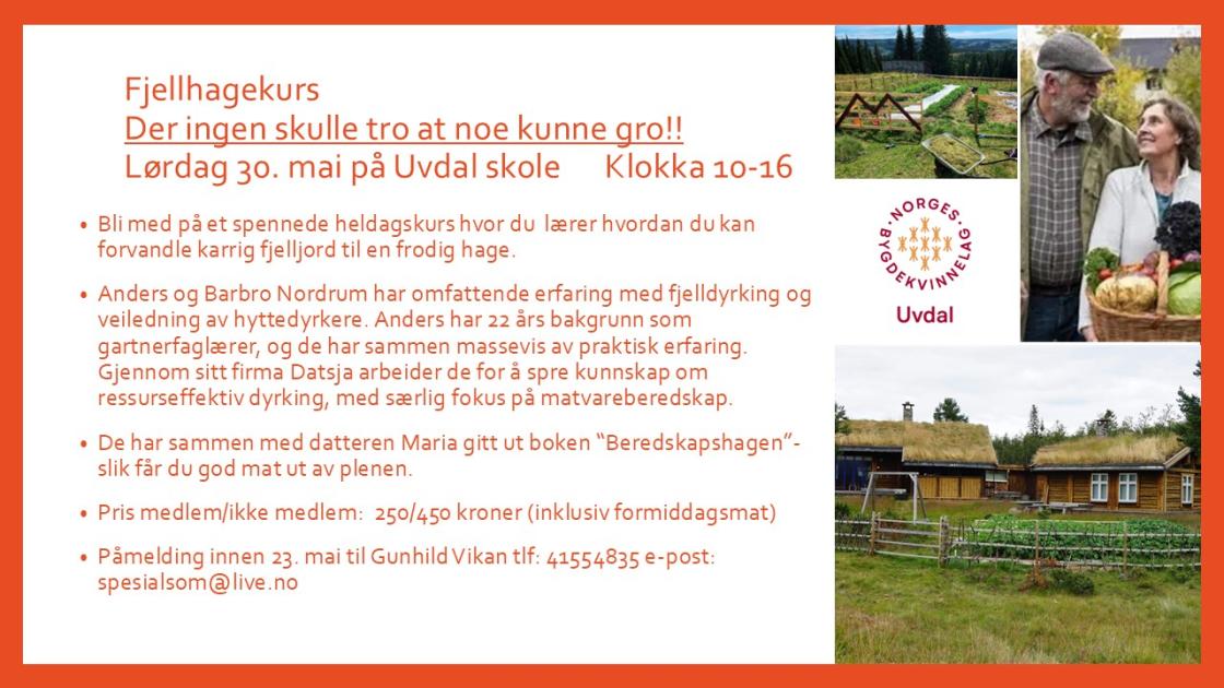 Den 30. mai kommer Anders og Barbro Nordrum til Uvdal skole for å lære oss om dyrking i fjellhager. Gjennom sitt firma Datsja arbeider de for å spre kunnskap om ressurseffektiv dyrking, med særlig fokus på matvareberedskap.