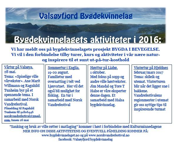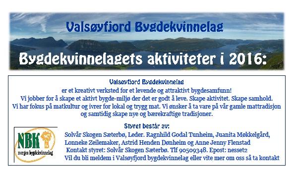 I vår sendte vi ut et flygeblad som ble lagt i postkassene i området. Her var det informasjon om de planene vi hadde i bygdekvinnelaget for året 2016. Aktivitet avler aktivitet så nå er det enda mer på gang enn det vi planla i vår. Har du lyst til å bli med på noe av det som foregår i laget?