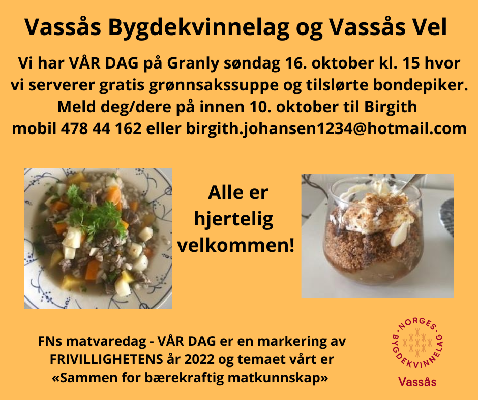 Søndag 16. oktober kl.15 inviterer Vassås Bygdekvinnelag og Vassås Vel til gratis grønnsakssuppe og dessert på Granly i Vassås. PÅ 16. OKTOBER «VERDENS MATVAREDAG» HAR VI VALGT Å GJØRE DAGEN TIL «VÅR DAG» I FRIVILLIGHETENS ÅR. TEMAET VI HAR VALGT ER «SAMMEN FOR BÆREKRAFTIG MATKUNNSKAP». Alle er velkommen!
