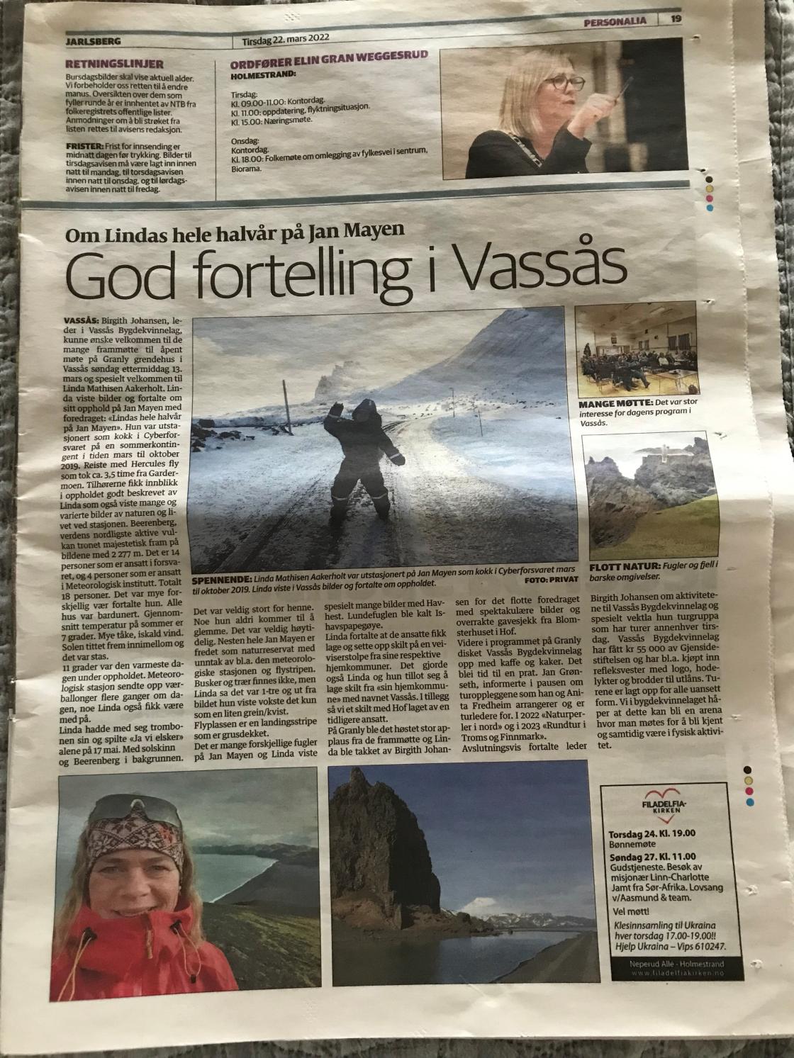 "God fortelling i Vassås" stod det å lese i Jarlsberg avis 22. mars-22. Vassås Bygdekvinnelag arrangerte åpent møte på Granly i Vassås 13. mars-22 hvor Linda Mathisen Aakerholt viste bilder og fortalte om oppholdet sitt på Jan Mayen 25/3 -2/10-19. Hun var utstasjonert som kokk i Cyberforsvaret på en sommerkontingent i denne perioden.