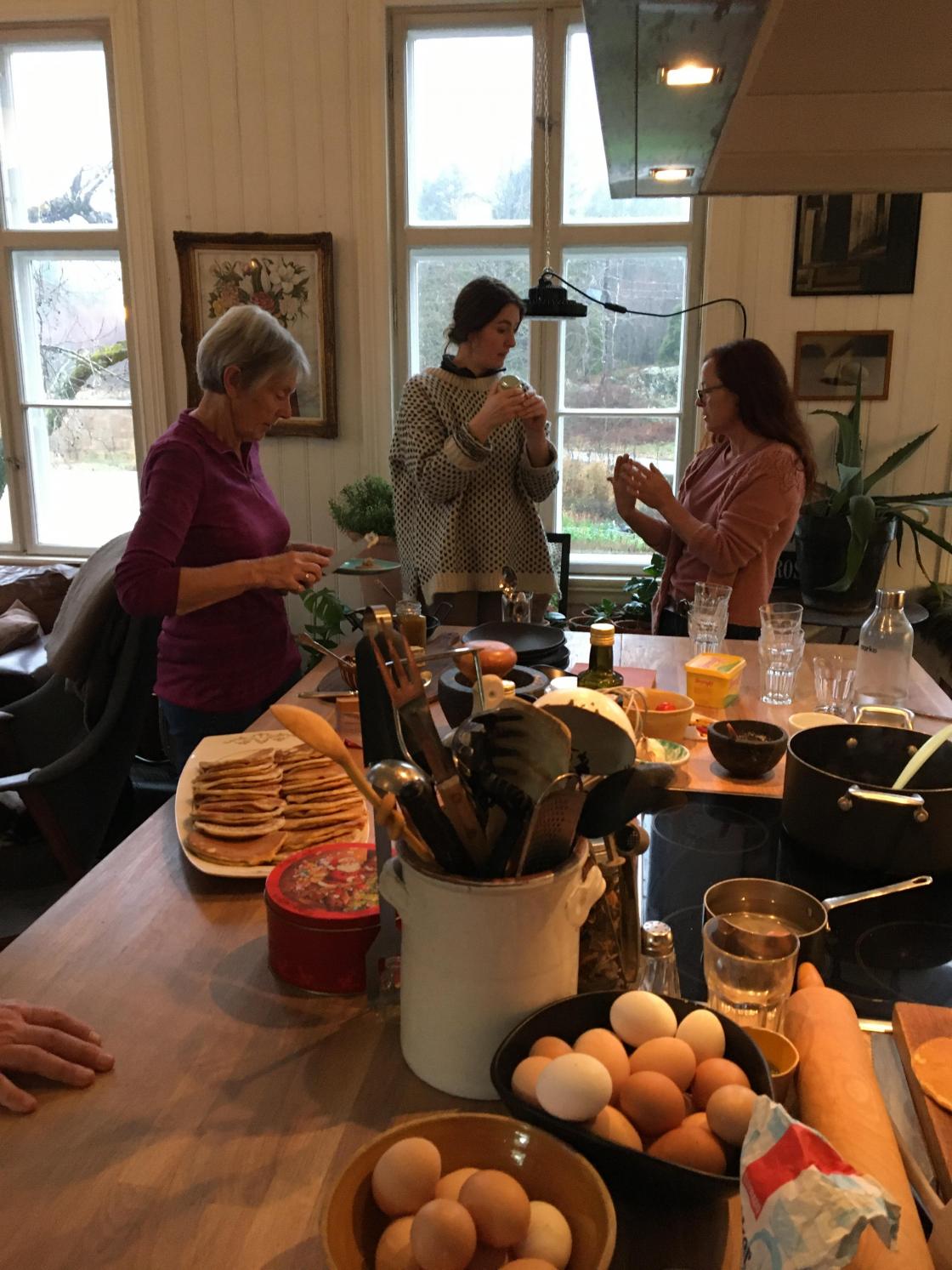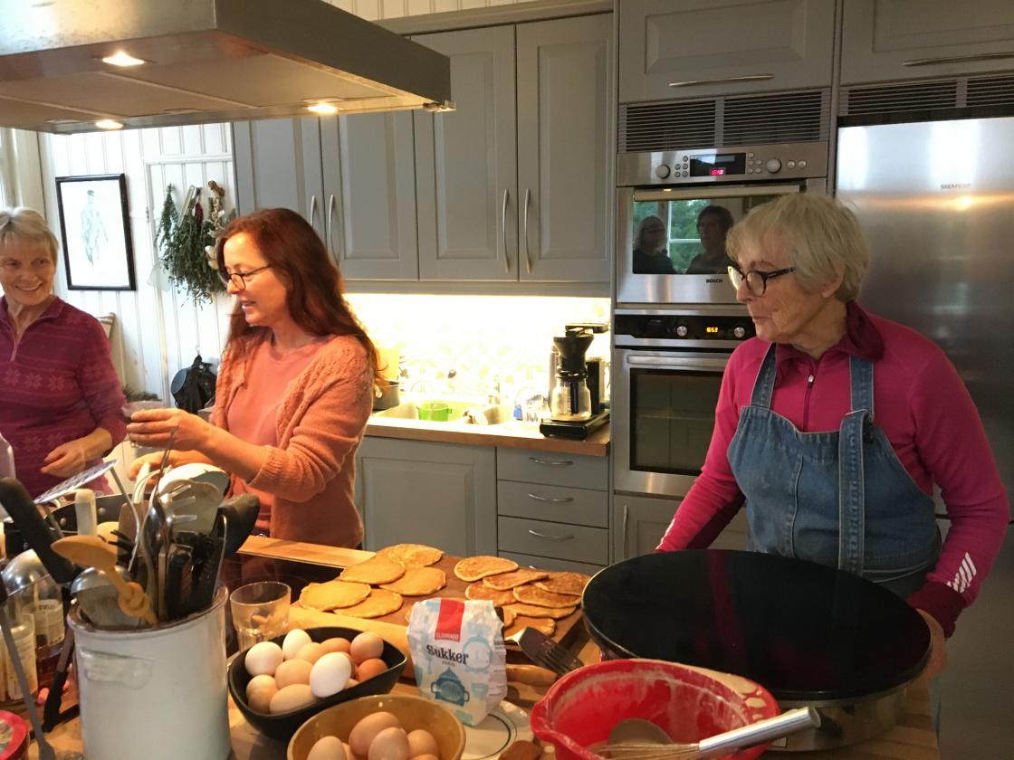 Åtte forventningsfulle kursdeltakere var samlet en lørdag for å lære å lage skikkelige julekranser. Tove Austad som eier og driver Åkerblomsten var kursholder. Det var den beste aktiviteten vi kunne hatt på en regntung novemberlørdag! Da vi kom hadde de fyrt i kakkelovnen i storstua, gløggen var varm og materialene lå klare. Tove viste og forklarte for oss, og vi boltret oss i massevis av materialer! Resultatet var 2 flotte dørkranser som alle var fornøyd med! Også så hyggelig vi hadde det! I pausen skulle vi nyte medbrakt mat, men vertskapet vartet opp med både nystekte sveler og gløgg i det koselige kjøkkenet. Tusen takk til Tove for et vellykket kurs!