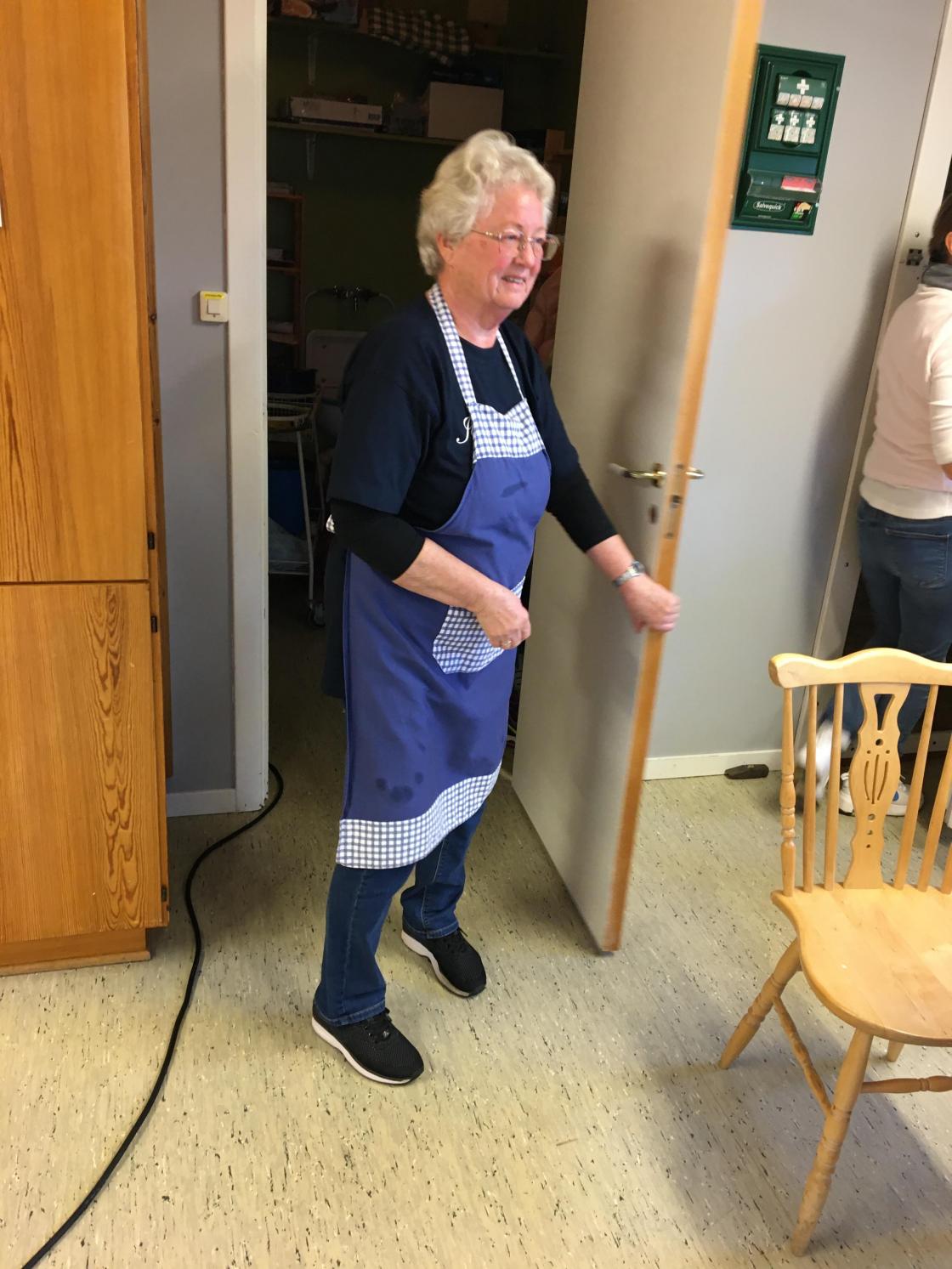 Hovedretten ble også laget på formiddagen, vi var til sammen 16 medlemmer involvert i jobben med alt fra å skrelle poteter, steke medisterkaker, lage saus, kålstuing og rørte tyttebær, til rigging og borddekking. Og ikke minst rydding og oppvask hele dagen!