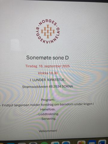 Det er sonemøte tirsdag 16.september i sone D. Vi håper menge har lyst til å ta turen. Dere må ordne kjøring selv. Meld dere på til 41193535 innen 9.9.