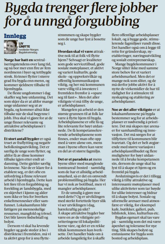 Temaet arbeidplasser fikk også synlighet, blant annet med dette leserinnlegget fra nestleder i Norges Bygdekvinnelag Liv Grøtte som var på trykk i Adresseavisa 4. september.