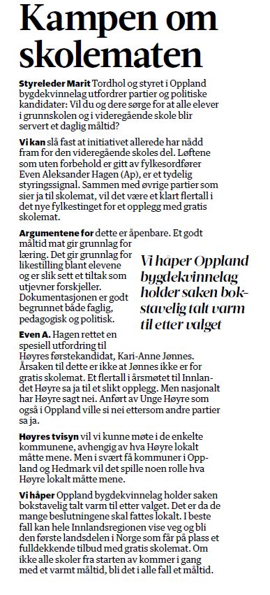 Spesielt hett var debatten om skolemat i avisene Drammens Tidende, Oppland Arbeiderblad og Gudbrandsdølen Dagningen, hvor flere ulike partier fortsatte å diskutere og komme med sine meninger i debattene initiert av Bygdekvinnelaget. I Gudbrandsdølen Dagningen fikk Oppland Bygdekvinnelag til og med hederlig omtale på lederplass den 29. juli for initiativet, og det ble påpekt at det i den videregående skolen allerede så ut til å bli en seier for skolematen i fylket. "Vi håper Oppland Bygdekvinnelag holder saken bokstavelig talt varm etter valget. Det er da de mange beslutningene skal fattes lokalt", skrev redaktøren.