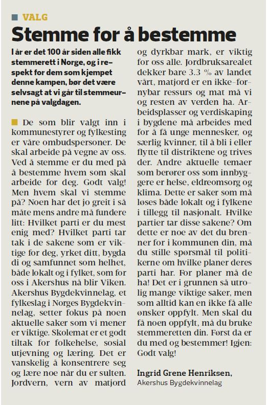 Akershus Bygdekvinnelag ønsket å sette fokus på stemmeretten og hvor viktig det er at alle benytter seg av sin demokratiske rett til å stemme. Samtidig fikk de sneket inn noen gode punkter om Bygdekvinnelagets fokussaker i innlegget sitt "Stemme for å bestemme", som de hadde på trykk i Eidsvoll Ullensaker blad og Indre Akershus blad.